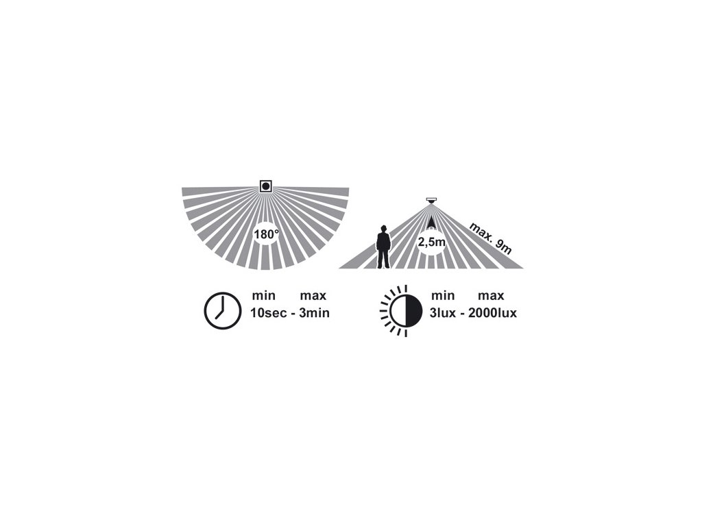 Před připojením k el. síti otočte tlačítko LUX do mezní polohy na ,,SLUNCE,, (protisměru hodinových ručiček) a tlačítko TIME do mezní polohy na min (-) ve směru hodinových ručiček. Jakmile svítidlo připojíte k elektrické síti, svítidlo se rozsvítí na dobu 30 sek, během které dojde k nastavení senzoru v daných podmínkách. Až po zhasnutí světla proveďte nastavení hodnot LUX a TIME do vámi požadovaných hodnot.