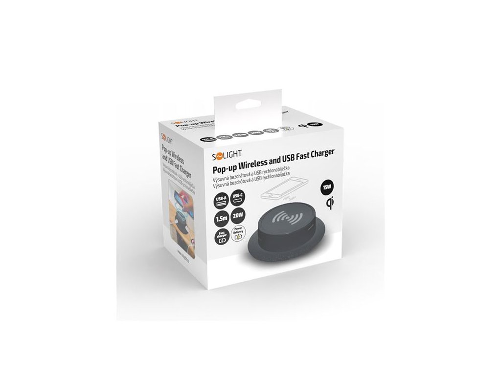 Solight DC64BW-PD20 je chytré řešení pro ty, kteří chtějí mít rychlé nabíjení vždy po ruce, ale nechtějí kazit čistý vzhled pracovního stolu nebo kuchyňské linky. Tato výsuvná nabíječka kombinuje bezdrátové Qi nabíjení až 15 W s USB-C Power Delivery (20 W) a USB-A Quick Charge 3.0 (18 W).