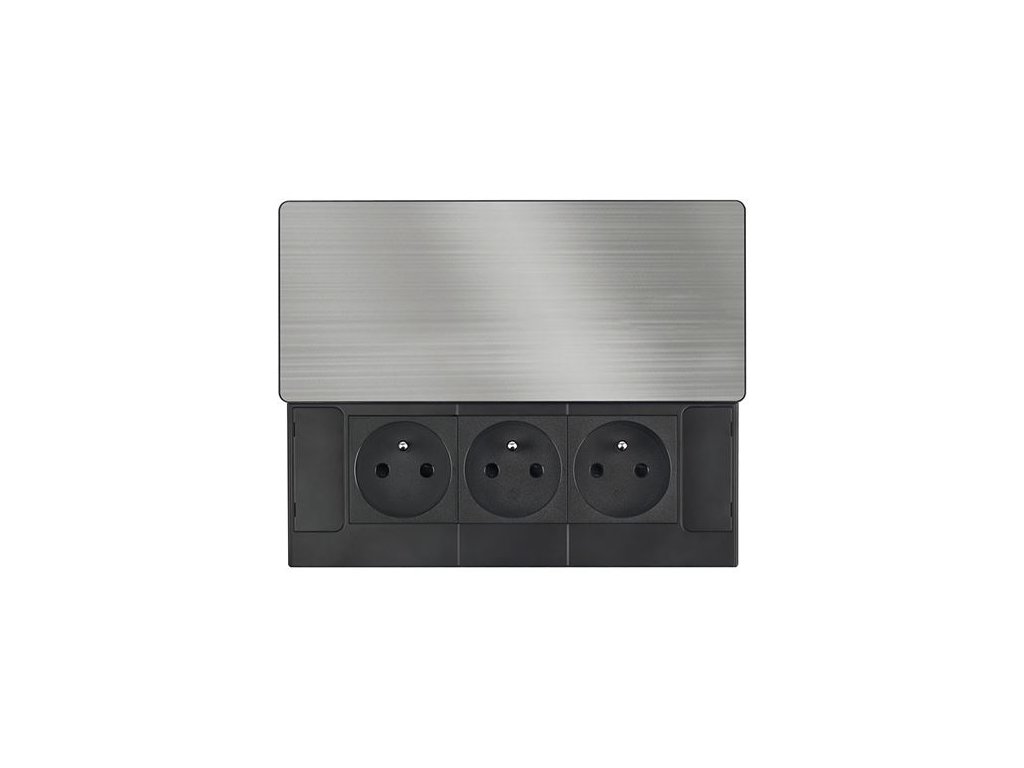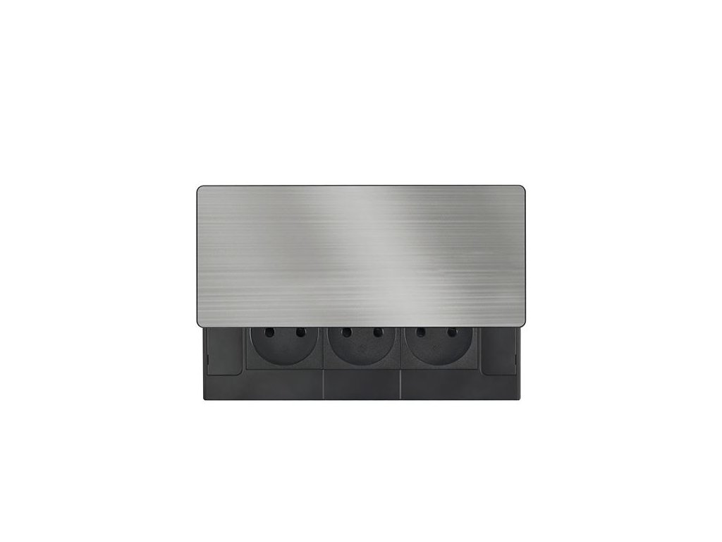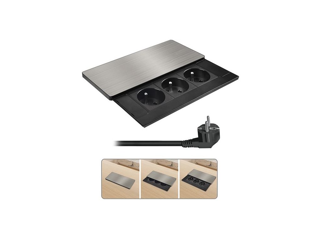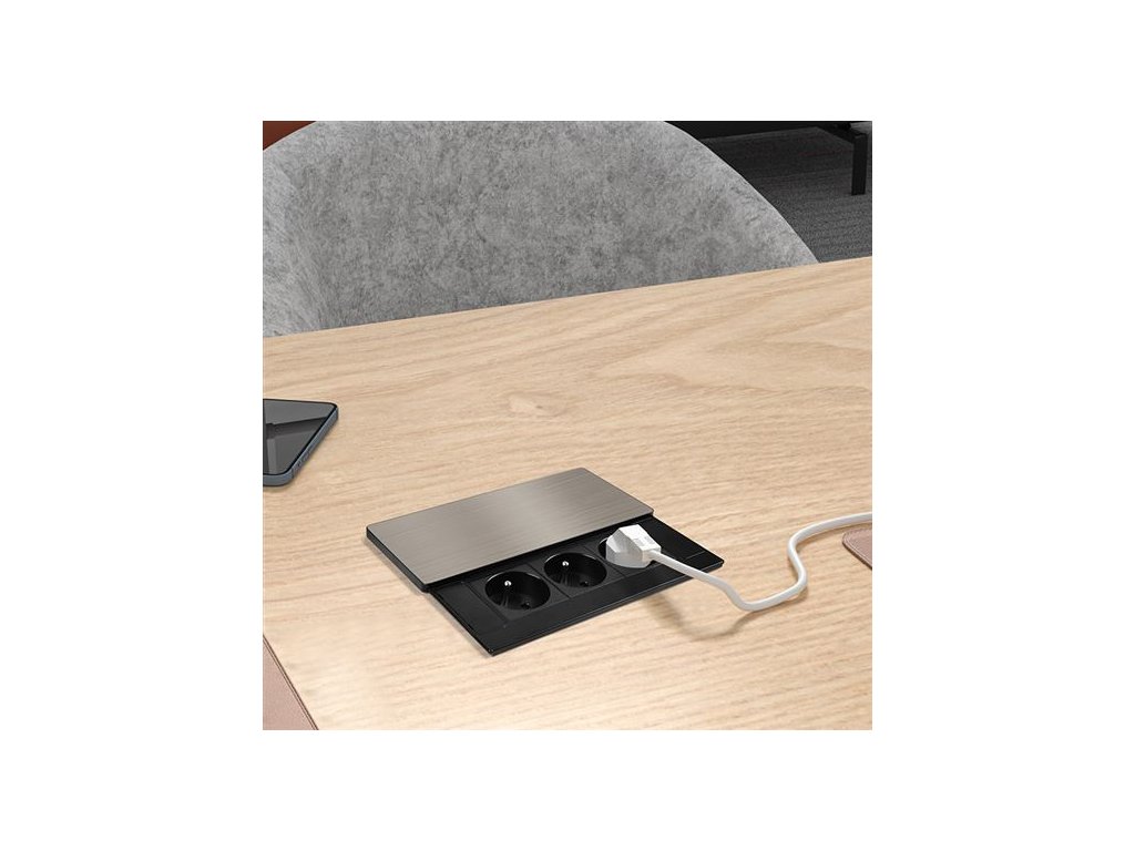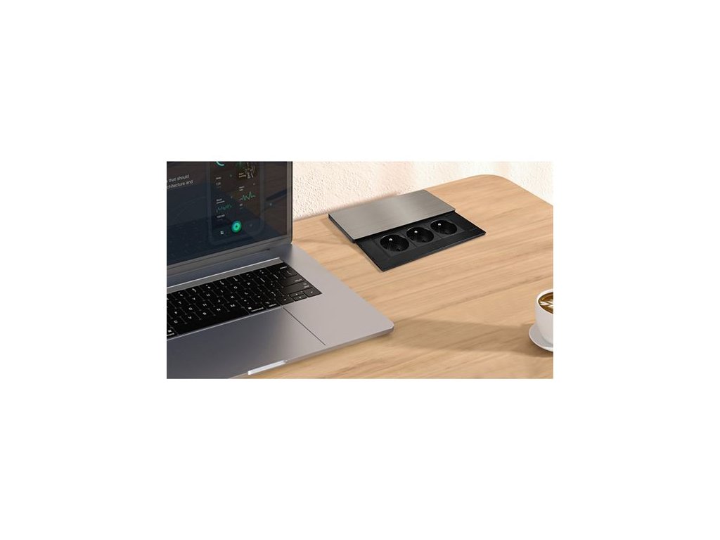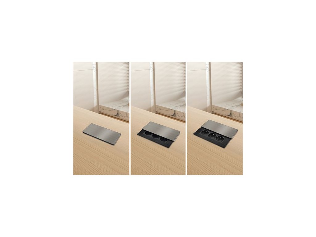 Vestavný zásuvkový blok je funkčním a zároveň designově elegantním doplňkem pracovních stolů, kuchyňských linek i kancelářských prostor. Umožňuje přivést elektrickou energii přímo tam, kde je potřeba, a přitom zůstává diskrétně skrytý pod decentním posuvným krytem z tmavého nerezu (inox).