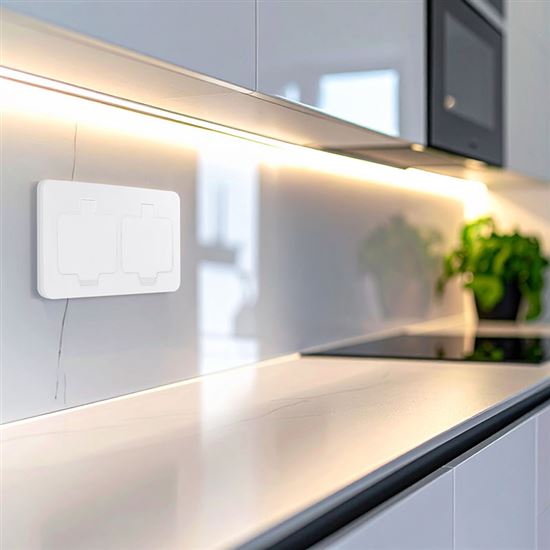 Zásuvka je vhodná pro interiér i venkovní prostory – terasy, pergoly, dílny nebo technické místnosti. Víčko se otevírá do úhlu 120°, je vybaveno pružinovým mechanismem a dětskou pojistkou. Součástí balení je instalační krabice s gumovými průchodkami, celkové rozměry činí 166 × 90 × 42 mm, hloubka zapuštění 36 mm. Konstrukce umožňuje mokré čištění a zajišťuje spolehlivý provoz i ve vlhkém prostředí.